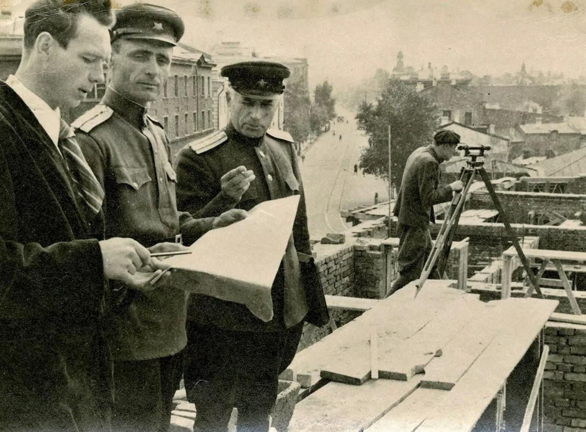 На снимке 1946 года — московский архитектор Евгений Янко в военной форме на строительной площадке дома по адресу Ленина, 24. Как главный инженер «Военпроекта-12», он участвовал в проектировании многих зданий в центре Иркутска.
