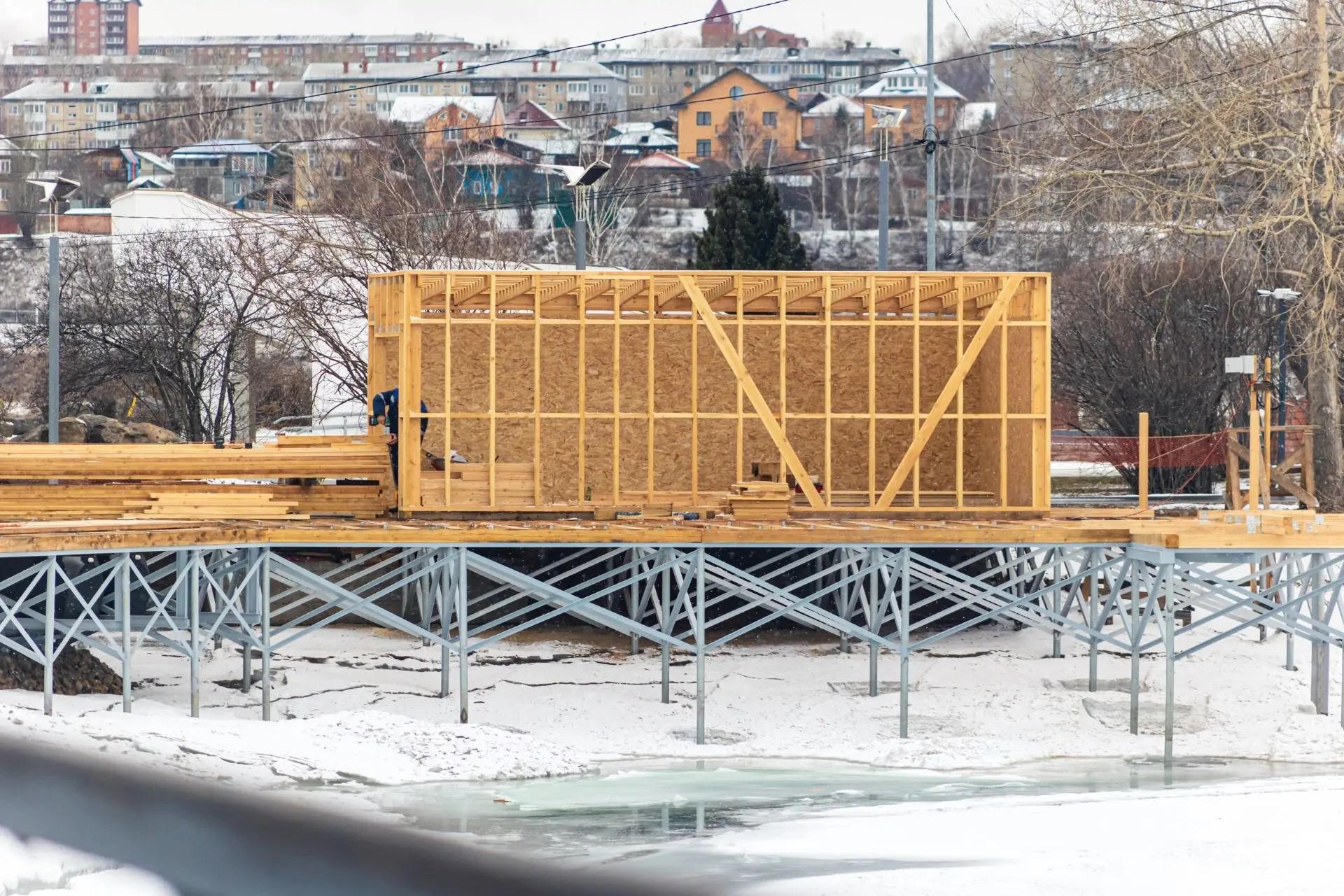 На острове Юность в Иркутске после масштабного благоустройства в 2025 году возводят новую деревянную конструкцию.