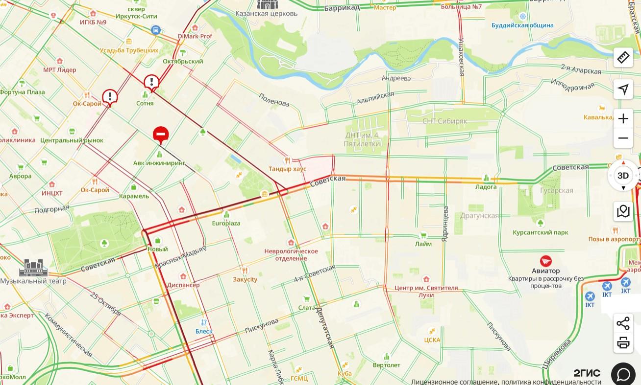 Сервис «2ГИС» показывает серьёзные затруднения движения в районе центрального рынка, на улицах Советской и Байкальской. Наибольшие скопления транспорта наблюдаются на следующих улицах, отмеченных на картах красным цветом: